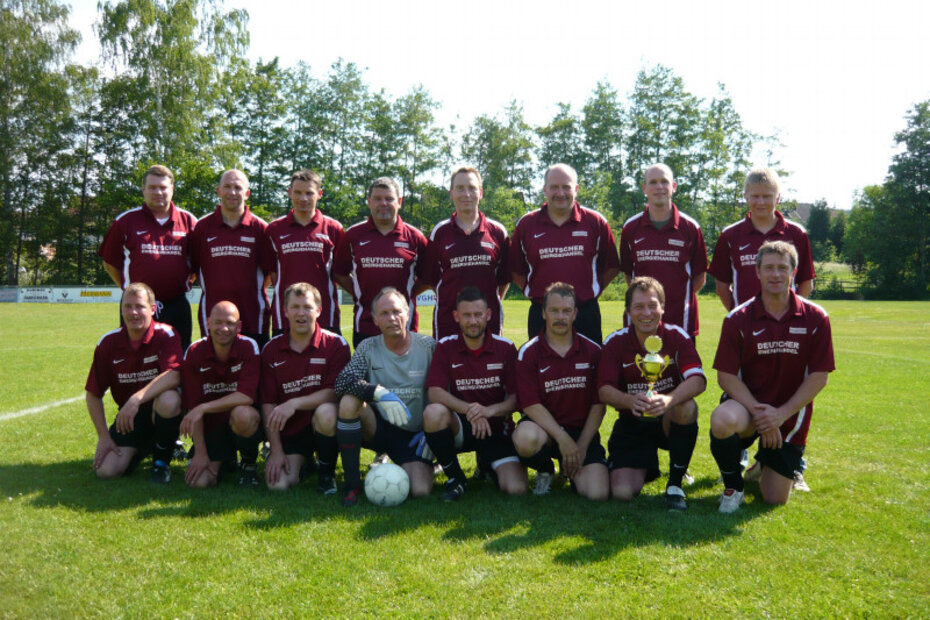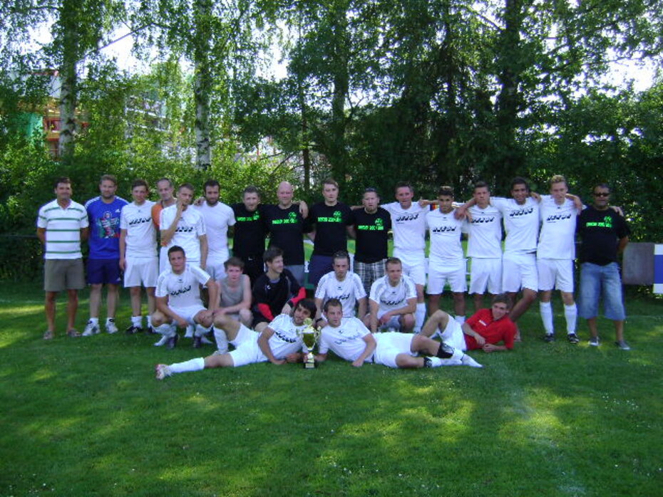 Vorn von links: Nils Hillemann, Lars Metscher, Michael Horst, Mark Hesse, Johannes Eberl, Manuel Pfeuffer, Dennis Ippensen, Sascha Magnus, Dehran Dilaj , Simon Thiele und Fußballobmann Dirk Renziehausen.