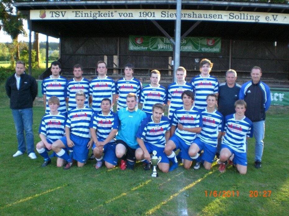 Hinten von links: 1. Vorsitzender Olav Opolka, Staffelleiter Alfred Wilfer, C-Trainer Kurt Riedinger, Jan Knöchel, Trainer Marki Grube, Matthias Reichel, Marius Lüdecke, Stefan Minor, Florian Thiele, Marcus Harms, Torwarttrainer Torsten Wenig, Benny Wendt, Marc Wendt, Chris-Hendrik Engelhardt, Julian Malec, Betreuer Frank Duymelinck, Nikolas Teschauer, Kreisspielausschussvorsitzender Heinz Schwingel, 1. Vorsitzender NFV Northeim-Einbeck Gerhard Haupt.