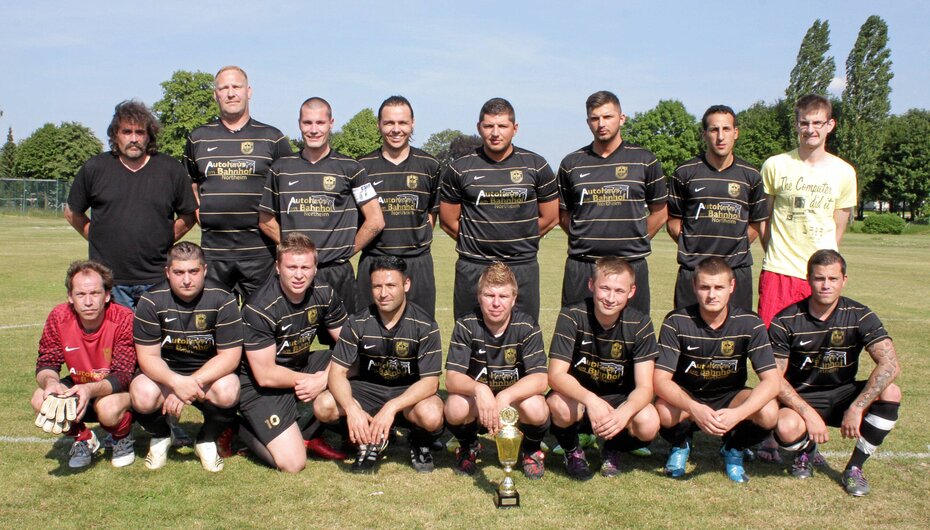 Hinten von links: Trainer Ralf Behrens, Dirk Mittelstädt, Andreas Behrens, Zafer Kilic, Driwon Mehmeti, Dritan Mehmeti, Jasin Trabelsi, Sasa Djurdjevic.