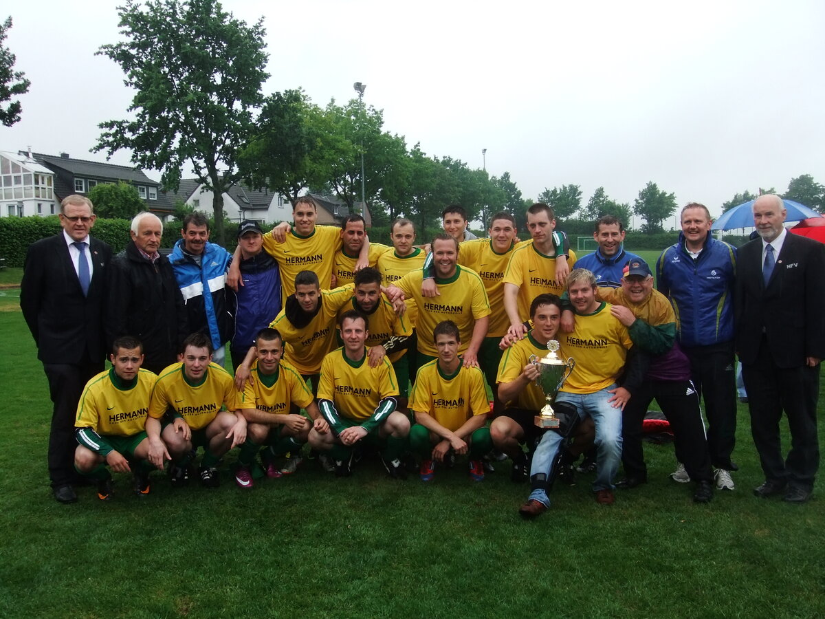 Stehend von links: Vorsitzender des Kreisspielausschusses Heinz Schwingel, Fußballfachwart Günter Schlemme, Lars Grünhagen, Pokalspielleiter Alfred Wilfer, Marvin Schulze, Jan Philipp Bauer, Dominik Wichmann, Michael Peters, Bastian Kühn, Patrick Schlemme, Florian Brenninger, Bastian Becker, Ben Fotheringham, Trainer Rolf Eckhardt, Betreuer Jens Henniges, Kreisvorsitzender Gerhard Haupt.