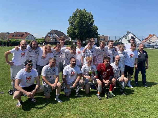 Von links: Jasin Trabelski, Marcel Cohrs, Felix Rädeker, Sebastian Urbainczyk, Jan Bode, Philipp Schmitz, Zhora Hambardzumyan, Kevin Eckert, Oliver Heisig, Marcel Köpke, Kevin Vives, Florian Ternes, Daniel Bikic, Mehmet Ciceik, Denny Cohrs, Sebastian Rode, Dimi Ditz, Dimitrios Behrens, Ibrahim-Alperen Karaca, Lennart Seeger, Betreuer Andreas Wölke, Trainer Benjamin Statz, Staffelleiter Jörg Henne, Kreisvorsitzender Henning Hartje.